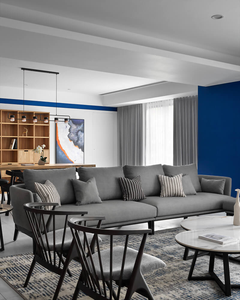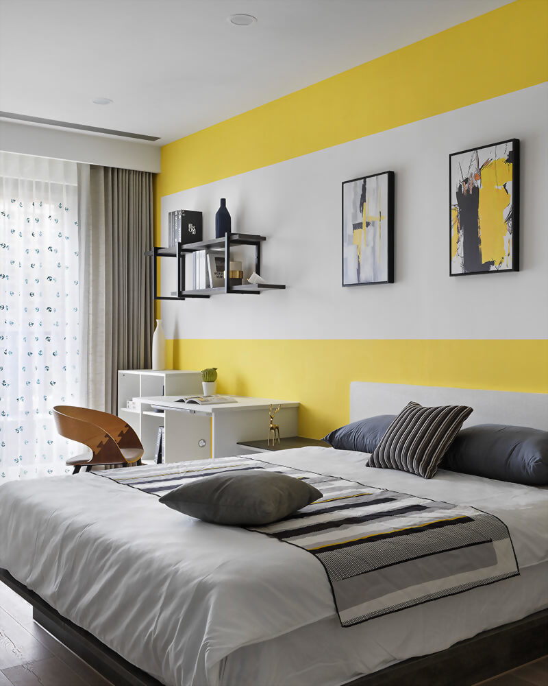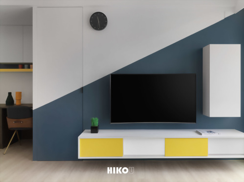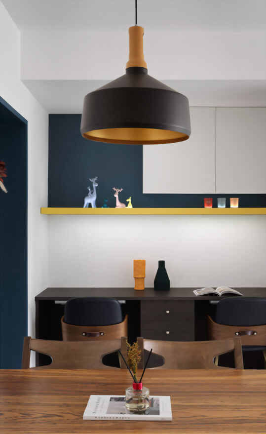設計上使用油漆做為主體的變化,亮色選用黃色搭配,有著陽光朝氣的感受,天青石色作為銜接亮色及暗色的中間色調,使黃色成為空間裡點綴的亮點,深色木紋的系統家具增加空間的穩定,天青石色中和了兩者之間的衝突,三者的搭配使視覺有著平衡的感受。